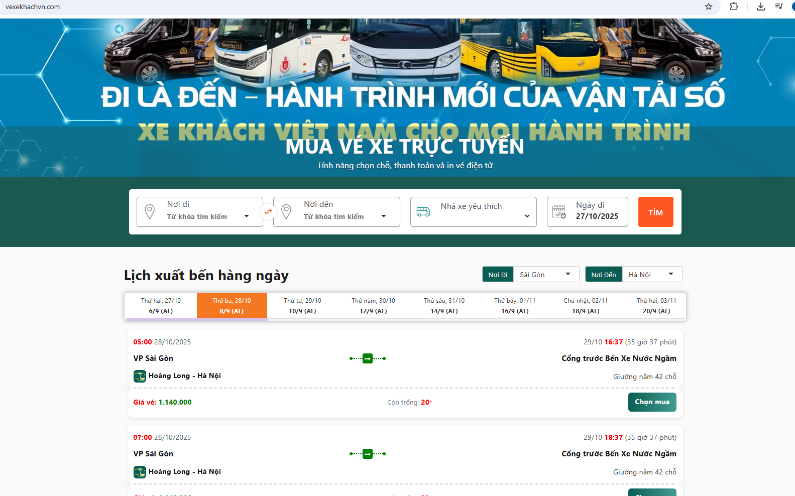 Vexekhachvn là nền tảng đặt vé xe khách, xe trung chuyển và xe hợp đồng hoạt động chuyên nghiệp, tổng hợp nhiều nhà xe uy tín tuyến Vũng Tàu - Sài Gòn (sân bay) như: Hoa Mai, Bến Thành Travel, Thành Vinh. Vie… Mọi thông tin về giá vé, giờ khởi hành, điểm đón trả đều được niêm yết công khai, minh bạch, giúp hành khách dễ dàng lựa chọn chuyến đi phù hợp với nhu cầu cá nhân.